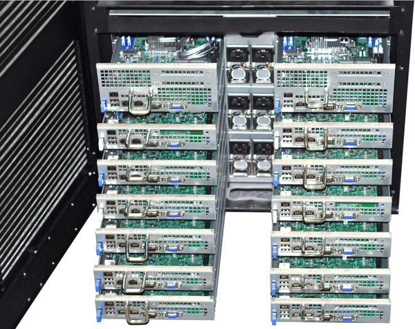 AG贵宾厅融合一体机就是解决环境使用问题而推出的综合性计算产品,它不需要专业的机房设施,不需要专业的配电和空调设备,放在办公室或实验室接墙电就可使用, 具有低噪音、低功耗等特点。最高可以安装14个双路XEON E5 处理器的刀片服务器,48个外置热插拔硬盘存储,内置一个万兆网络交换机安装空间,带有整体状态显示和控制系统,内部散热和防尘处理。专为办公室应用环境 设计,它在众多方面超越了传统机架式服务器、刀片服务器和机群服务器,是高稳定、高性能、低环境要求的新一代桌边型高性能计算机。它采用整体优化的设计, 有效降低了系统功耗,再加上其人性化的设计、很强的系统扩展能力、卓越的性价比和计算密度,可以覆盖更广泛的个人及工作组用户对高性能计算的需求,与传统 的高性能计算机相比,AG贵宾厅融合一体机可给予更有竞争力的整体解决方案,是更好满足中小高性能计算需求的理想平台。下图为14个刀片打开效果图: